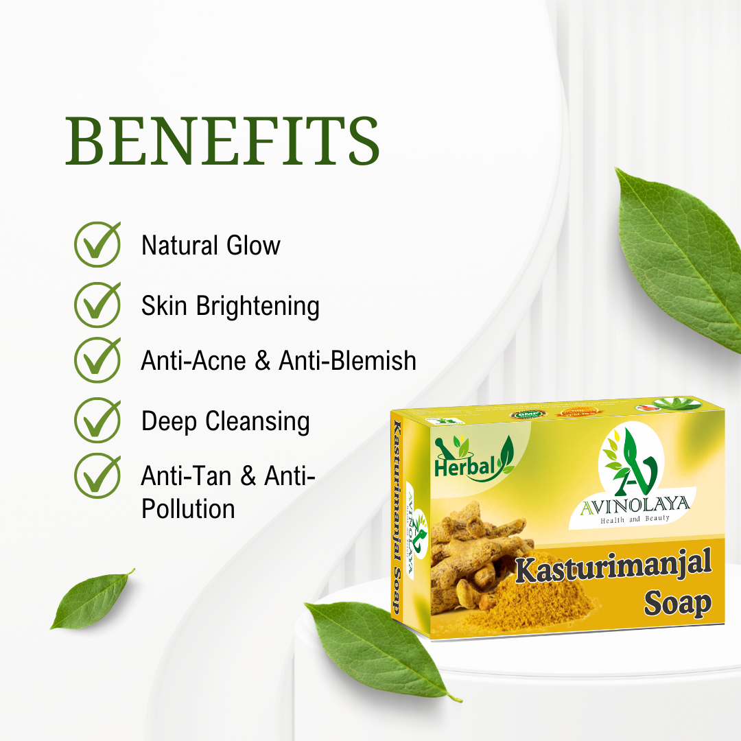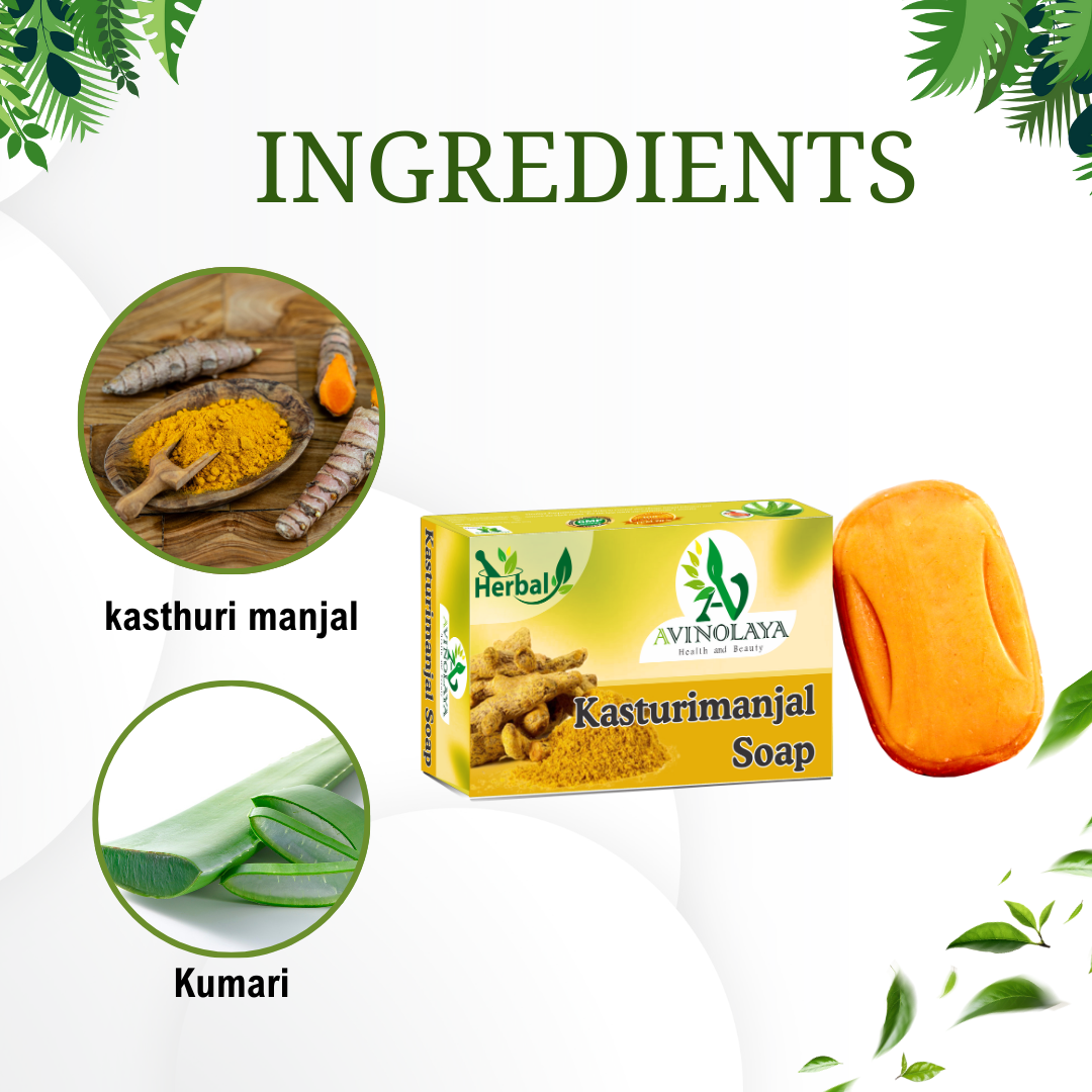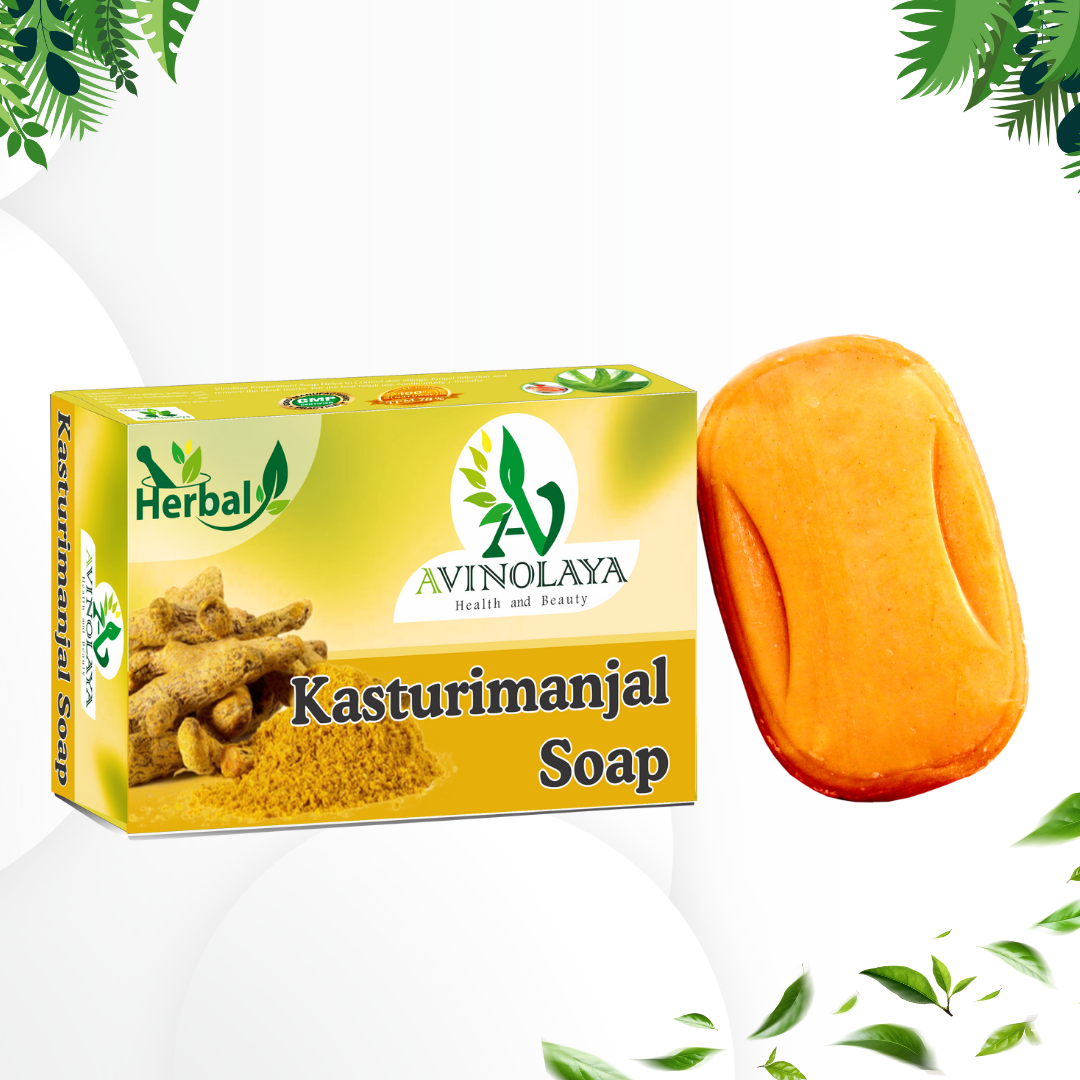 Reveal your natural radiance with Avinolaya Kasthurimanjal Soap, enriched with the goodness of wild turmeric. This Ayurvedic soap helps fight blemishes, even out skin tone, and give your skin a golden glow. Its herbal formula makes it gentle enough for daily use on all skin types.